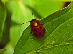 These beetles are 6–7 mm long, the head is black, elytra and pronotum are red, with two black dots on the pronotum and five black dots on the elytra. The larvae are yellow-gray, with black spots on the back and sides and three pairs of thoracic legs.[4]