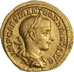 Gordian III (Latin: Marcus Antonius Gordianus; 20 January 225 – c. February 244) was Roman emperor from 238 to 244. At the age of 13, he became the youngest sole emperor of the united Roman Empire.[6][b] Gordian was the son of Maecia Faustina[7] and her husband Junius Balbus, who died before 238.[8] Their names are mentioned in the unreliable Historia Augusta. Maecia was the daughter of Emperor Gordian I and sister of Emperor Gordian II.[7] Very little is known of his early life before his acclamation.