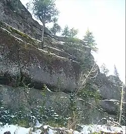 The Gornaya Shoria megaliths, meaning Mountain Shoria megaliths, are rock formations found within the Mountain Shoria (Gornaya Shoriya)(Russian: Горная Шория) region that comprises the southern part of Kemerovo Oblast in southern Siberia, Russia.[1][2] The Gornaya Shoria megaliths, also known as the Surak-Kuilum megalithic complex and by other names, form the ridgecrests and summit of Mount Kuylyum (Kuilum, Kulyum)(Russian: Горна Куйлюм), 1,203 m (3,947 ft) in elevation. The base of this mountain is located 8 km away from the village of Orton (Russian: Ортон). Mount Kuylyum is part of the Kulyum-Surak granite massif in the Shoria Mountains. The ridgecrests and summits of this massif ranges in elevation between 700 and 1,203 m (2,297 and 3,947 ft).[3]