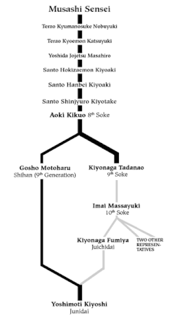 In 1961, Aoki Kikuo named one of his closest disciples, Gosho Motoharu, as Shihan[1] (master responsible for teaching the techniques of the ryū) and Soke Daiken (adjunct successor) of the 9th generation, and other disciple, Kiyonaga Tadanao, as 9th Soke,[1] with the goal to make sure that the techniques of the style were passed to the future generations. Before, in 1955, Gosho Motoharu had received Menkyo kaiden, the license of total transmission in Hyōhō Niten Ichi-ryū and Sekiguchi-ryū, the two schools that Aoki Kikuo was headmaster.