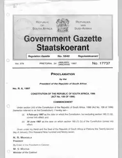 ![]() Government Gazette 17737 from 1997, which states President Nelson Mandela promulgating when the Constitution of South Africa came into effect. | |