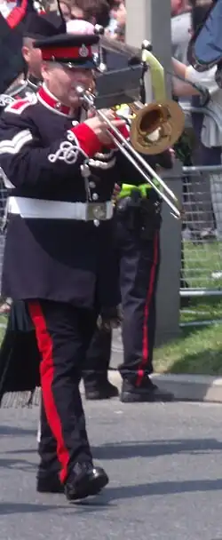 The full brass-and-reed military band provides concerts and music for regimental functions, other military events, and civilian engagements. The band includes three specialized musical sub-units: the Fanfare Trumpeters, the Brass Quintet, and the Woodwind Quintet. The band numbers between 30 and 35 members and performs at many regimental and brigade events. It is often called on to provide music for civilian and local government events[6] including the Royal Agricultural Winter Fair, Opening of Parliament at Queen's Park and The annual Queen's Plate. The band is managed by a director of music and a band sergeant major. It is a dismounted band, but dresses as dragoon guards.[7] The band performed The Garb of Old Gaul in the 2000 X-Men film.[8]
