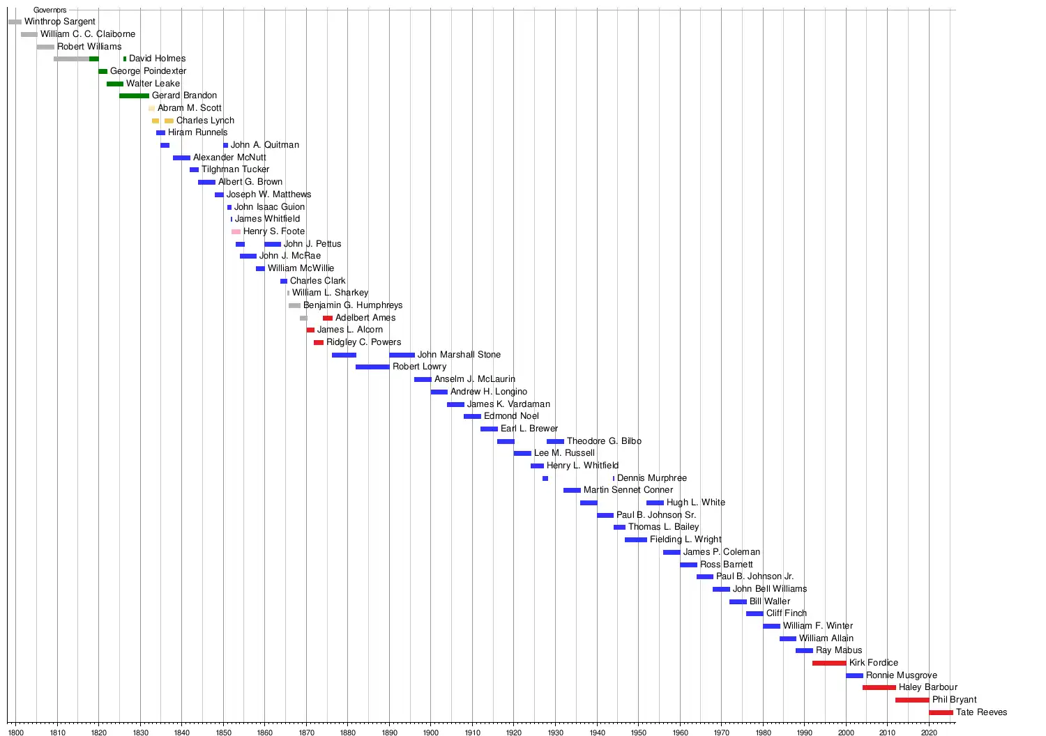 Upon its creation in 1798, the Mississippi Territory was given a government which included a governor.[2] Mississippi was given statehood in 1817. Its first constitution provided for a weak governor with limited appointive powers and limited to serving a two-year term.[3] The term was extended to four years in the 1869 constitution.[4] In 1918, legislation was passed enabling the governor to submit budget proposals to the legislature.[5] In 1986, voters approved an amendment to the constitution permitting the governor to seek election to a consecutive term.[6][7]