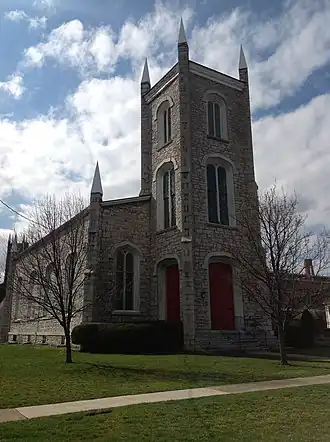 Grace Episcopal Church Complex is a historic Episcopal church complex located at Lyons in Wayne County, New York. The complex consists of a contributing stone church building begun in 1838, a contributing frame rectory begun about 1833, and a contributing parish house built in 1887–1888. The church building is Gothic Revival in style and constructed of rubble limestone walls with cut limestone trim. The rectory is an irregularly massed two story, wood-frame building incorporating a former private residence built at this site about 1833 in the vernacular late Federal / early Greek Revival style. The parish house is a single story, frame building designed in the Queen Anne style.[2]