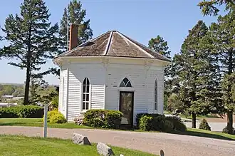 Graceland Cemetery Chapel is a historic building located in Avoca, Iowa, United States. The frame octagon-shaped building was constructed about 1875 in Graceland Cemetery, the town's public cemetery. The building's architecture has picturesque qualities to it, and it embodies various revival themes.[2] Its narrow, pilastered corners and the entablature along the roof line evoke the Greek Revival, its pointed arch windows and doorways the Gothic Revival, and its wide bracketed eaves the Italianate. Its interior is an open space with built-in benches along the walls. Over the years the building has been used as a place for funerals, a temporary mausoleum, the sexton's office, and storage. It was listed on the National Register of Historic Places in 1986.[1]