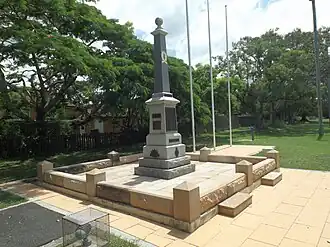 The outpouring of grief in Australia that accompanied the deaths, and overseas burial, of 60,000 service people in World War I, led to a period of memorial building across the nation. A memorial was unveiled in Graceville Recreational Reserve on 28 November 1920 by Lieutenant E.M. Little, chairman of the local R.S.S.A.L.I.A.[2] Funded by public subscriptions, the memorial was designed by Mr I Bennet, and was erected by Andrew Lang Petrie Monumental Works, at a cost of £225. On a copper scroll made by Ernest Gunderson, 51 soldiers and one nursing sister were included in a list of Sherwood Shire's fallen. 265 men, and seven nurses had enlisted from the Shire. Between 1985 and 1996, a low sandstone wall was built around the monument, and three flagpoles were set to the west. Plaques representing each of the three armed services have also been added to the north, east and west sides of the monument since 1985. In 2004 sandstone pavers replaced the bitumen that had been laid around the monument.[1]
