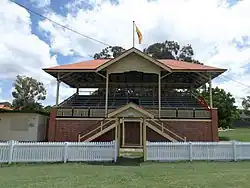 The Western Suburbs District Cricket Club was formed in 1921, and it has had an association with the park since 1924. In 1928 the Queensland Cricket association took out a twenty-year lease on playing ovals one and two, and a seasonal lease on oval three. The grandstand facing the number one oval was opened in September 1936. The Brisbane City Council Register of new buildings lists the grandstand on 13 February 1936, with H. Sanham as the contractor, and the Brisbane City Council as the architect. The cost of the brick and timber building was listed at £1000. The two changing rooms and storage area within the brick ground floor have been renovated and reconfigured over time, and the current latticed balustrade at the front of the seating was introduced since 1985. Two similar grandstands currently exist in Brisbane, one at Bulimba Memorial Park (built 1923), and one at Langlands Park (1937).[1]