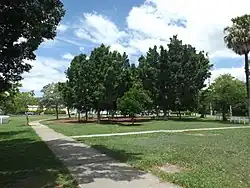 Mature memorial bunya trees and cotton trees are planted on the northern and western perimeter of the park. An avenue of mature bauhinia, cabbage tree palms, and Chinese elms runs from Oxley road to the war memorial, and a single row of mature figs and camphor laurels runs west from the memorial to Appel Street. Behind the grandstand are two mature Moreton Bay fig trees, and two mature bunya pines. The Oxley Road frontage still has some mature fig trees and palm trees, along with more recent plantings.[1]