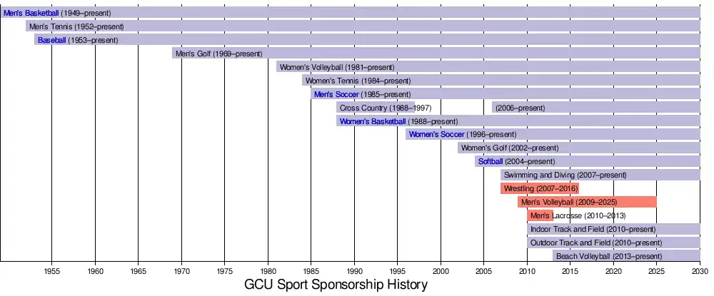 GCU discontinued varsity men's volleyball in April 2025, downgrading that team to club status.[44]