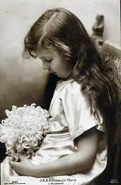 Maria was raised in Coburg and in Saint-Briac, France. She was born Princess Maria Kirillovna of Russia, but her father granted her the title Grand Duchess of Russia with the style Imperial Highness when he declared himself Guardian of the Throne in 1921. As a child, the dark-haired, dark-eyed Maria[1] took after her maternal grandmother, Grand Duchess Maria Alexandrovna of Russia, in appearance, with a wide, round face[2] and a tendency to be overweight and to look older than her actual age when she was still a teenager.[3]