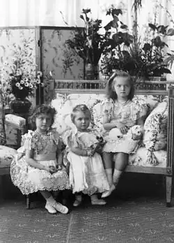 Tatiana was born on 10 June 1897. She was the second child and daughter of Emperor Nicholas II and Empress Alexandra. She weighed 3.9 kg at birth, and Dr. Ott used forceps in her birth.[32] When she regained consciousness from the chloroform used during the delivery, Alexandra saw the "anxious and troubled faces" around her and wept: "My God, it is again a daughter. What will the nation say, what will the nation say?"[32] Grand Duke Konstantin Konstantinovich wrote that "everyone was very disappointed as they had been hoping for a son."[32] Grand Duke George Alexandrovich, Nicholas' younger brother, told Nicholas "I was already preparing to go into retirement, but it was not to be."[32] Under the Pauline Laws, the Imperial throne of Russia could not pass to a woman unless all legitimate male lines died out. As such, Nicholas' heir was his brother George unless he had a son. Grand Duchess Tatiana's siblings were Grand Duchesses Olga, Maria, Anastasia, and Tsarevich Alexei of Russia. All of the children were close to one another and to their parents up until the end of their lives.