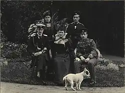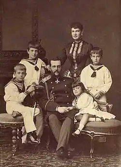 Grand Duke Andrei Vladimirovich of Russia was born on 14 May [O.S. 2 May] 1879 in Tsarskoye Selo, at his parents country residence, the Vladimir Villa.[1][2] He was the youngest of the four Vladimirovich sons; a sister followed him a few years later, and the eldest of his brothers died in early childhood.[3] His father, Grand Duke Vladimir Alexandrovich, a brother of Tsar Alexander III of Russia, was a renowned patron of the arts.[4] Andrei's mother, Grand Duchess, Maria Pavlovna, née a Princess of Mecklenburg-Schwerin, was one of the greatest hostesses of Russian society.[5] Both parents doted on their four surviving children: Andrei, his two eldest brothers, Kirill and Boris, and their younger sister, Grand Duchess Elena.[4] The children were educated at home.[2]