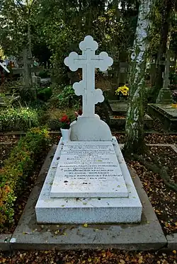 Despite poor health, Grand Duke Andrei lived to be 77 years old, an age reached by few in the Romanov family. He surpassed the longevity record held by his great-uncle, Grand Duke Michael Nikolaevich, by almost six months.[63] On the morning of 31 October 1956, Grand Duke Andrei worked in his study.[63] Having finished a letter on his typewriter, he felt dizzy, went to his bed to lie down and died suddenly.[63][64] He was buried wearing the uniform of the Horse Guard Artillery Brigade, which he had commanded during World War I.[64] Matilda Kshesinskaya died in Paris in December 1971 at age 99.[52] Prince Vladimir Romanovsky-Krasinsky died unmarried and childless in France in 1974, three years after his mother.[65][66]