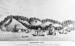 Grand Gulf was named for the large whirlpool, (or gulf), formed by the Mississippi River flowing against a large rocky bluff.[2] La Salle and Zadok Cramer commented on the dangers caused by the eddies at Grand Gulf. The British and Spanish created settlements in the area and it continued to grow after the land became part of the United States.[3] According to the Clarion-Ledger newspaper, "Of the three towns [in Claiborne County] mentioned as existing prior to 1829, Grand Gulf, eight miles northwest of Port Gibson, was by far the most prosperous. With several schools, two large hotels, two weekly newspapers, this flourshing town came very near being chosen as the county seat. By reason of its location on the Mississippi River, it was a commercial point of great importance. Old records show that from Sept. 1, 1834 to May 19, 1835, a period of less than nine months, it shipped 47,770 bales of cotton...The town was twice destroyed by fire and twice rebuilt."[4]