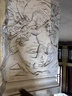On this front one can recognise the basement, marked by walls made of bare stone limestonea and large circular windows with grilles, which houses the rooms reserved for staff (kitchens, laundries, dormitories, etc.). In the centre of the rear façade is a majestic stone portico, leaning towards the Varese valley, which supports the ballroom and under which is the secondary entrance to the building. According to the original plan, this structure was to have been the arrival station of the funicular, but the idea was later abandoned due to the excessive noise of the engines.[15] Noteworthy are the decorations carved in stone and cement, the elaborate wrought-iron railings and the doccioni in the shape of a dragon, the work of Alessandro Mazzucotelli and, lastly, the imposing brick vaulting, details that give the portico a mysterious 'Gothic' appearance.