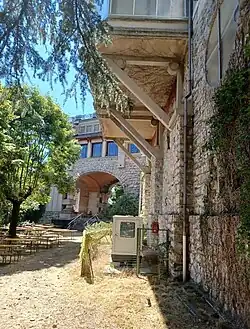 Beyond the portico, on the east wing of the building, one glimpses, on the first floor, the restaurant hall, partially built in a veranda cantilevered away from the building.