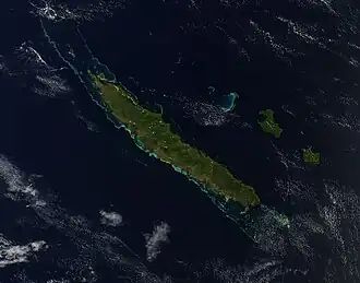 The island is located roughly 1,300 kilometres (810 mi; 700 nmi) east of Australia.[4] Grande Terre is oriented northwest-to-southeast; its area is 16,372 square kilometres (6,321 square miles). It is nearly 400 kilometres (250 miles) in length and 50–70 km (30–40 mi) wide in most places. A mountain range runs the length of the island, with five peaks over 1,500 metres (4,900 feet). The highest point is Mont Panié at 1,628 m (5,341 ft) elevation. Grande Terre is one of the largest islands in the Pacific Ocean.[5]