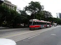 On the east, three subway stations on the Yonge-University-Spadina subway line stop at College Street (Queen's Park), Dundas Street (St. Patrick and Queen Street (Osgoode). There are streetcar lines on College, Dundas, Queen and Spadina, the Spadina line connecting to the Spadina station on the Bloor-Danforth subway line.