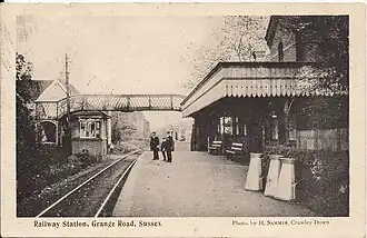 Grange Road was a railway station on the Three Bridges to Tunbridge Wells Central Line. The first station opened in 1860 and was sited on the east side of the level crossing. In 1876 a new enlarged station was opened on the west side of the level crossing, with a footbridge added in 1897.[2] The station and railway closed in 1967, a casualty of the Beeching Axe.[1] Good facilities in the station were withdrawn from 2.10.1961.[3]