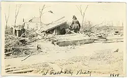 On the evening of May 3, 1919, at approximately 6:45pm, a tornado developed just south of the nearby town of Ulmer and moved east/northeasterly in a 200-ft wide path towards Grant City.[10] Due to the slow forward-movement,[2] residents had ample time to take cover. As the tornado passed through the town, large trees were uprooted and six houses were destroyed, leaving four others damaged.[10] The 2nd story of the brick schoolhouse had blown off [see photo], and the Methodist Episcopal Church was completely swept away, with pieces scattered for miles.[11] Wind speeds from the event were sufficient to move tombstones in the cemetery[3] and damage a brick building on the east side of Main Street.[7] Fortunately, no one was seriously injured as most had sought shelter in storm caves or cellars. Following the storm, many residents did not rebuild and left the community.
