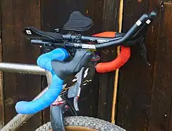 Gravel bicycles generally use drop bars, similar to racing and cyclocross bicycles, unlike mountain bikes and hybrid bicycles. Many gravel bikes are fitted with wider bars than would be typical for a road or cyclocross bike, and a few have been fitted with "flared" bars that angle outwards. Clip-on aerobar extensions are sometimes used, particularly in racing.[2]