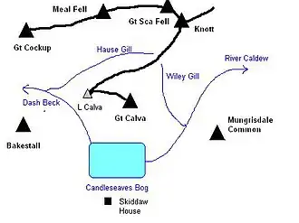 Great Calva appears from Skiddaw Forest as a steep sided pyramid, clad predominantly in heather. The summit is a curving ridge one-half-mile (800 m) long, with Great Calva at the eastern end and Little Calva to the west. The ridge itself is extremely wet underfoot. From between the two tops, Dead Beck runs down into Candleseaves Bog, the source of both the Caldew and Dash Beck. Great Calva has a prominent southern spur, around which the Caldew flows before steering north east for the Eden Valley. In a strict topographical sense Candleseaves Bog is the connection between Great Calva and Skiddaw, but it could hardly be described as a ridge route.