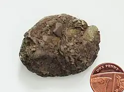 This Devonian conglomerate rests on the Birker Fell Andesite Formation, a thick sequence of andesite lava flows from the Ordovician Period, about 450 million years ago, and part of the Borrowdale Volcanic Group. This rock may be seen at the foot of the fell in the south-east corner, where a small quarry (at the beginning of the path along the south side of the fell) has extracted a little of this andesite.[8][9]