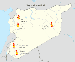 The Great Syrian Revolt (Arabic: الثورة السورية الكبرى, romanizedal-thawrat al-Sūriyyat al-kabir), also known as the Revolt of 1925, was a general uprising across the State of Syria and Greater Lebanon during the period of 1925 to 1927. The leading rebel forces initially comprised fighters of the Jabal Druze State in southern Syria, and were later joined by Sunni, Druze and Shiite and factions all over Syria. The common goal was to end French occupation in the newly mandated regions, which passed from Turkish to French administration following World War I.