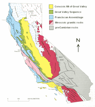 ![]() Geologic map showing location of the Great Valley Sequence. Modified from Irwin (1990)[1] | |