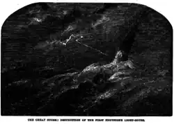 The first Eddystone Lighthouse off Plymouth was destroyed on 8 December [O.S. 27 November], killing six occupants, including its builder, Henry Winstanley. (John Rudyard was later contracted to build the second lighthouse on the site.) Two days later, a cargo ship struck the rocks and sank. She was the first wrecking to occur there since the lighthouse was constructed five years prior.[8] Another ship, torn from its moorings in the Helford River in Cornwall, was blown for 200 miles (320 km) before grounding eight hours later on the Isle of Wight. The storm also caught a convoy of 130 merchant ships sheltering at Milford Haven, along with their man of war escorts Dolphin, Cumberland, Coventry, Looe, Hastings and Hector. By 3:00pm the next afternoon, losses included 30 vessels.[9]