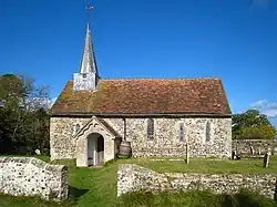 Minimal restoration was performed in the 19th century, in contrast to many other Sussex churches, although the original bell-turret was replaced by one topped with a spire.[6][10] A new entrance, set in a porch, was added on the south side, and a vestry was built onto the north wall—although this was removed in the mid-20th century.[6] Most of the internal fittings are early 19th-century.[3] When the vestry was being built, five soldiers were found buried next to the church wall: they had been killed at the Battle of Greatham Bridge during the English Civil War.[6][11]