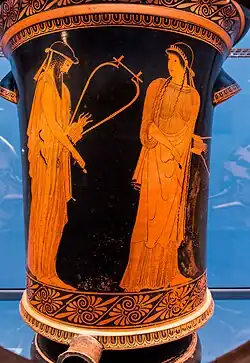 Much of Greek lyric is occasional poetry, composed for public or private performance by a soloist or chorus to mark particular occasions. The symposium ('drinking party') was one setting in which lyric poems were performed.[4] 'Lyric' was sometimes sung to the accompaniment of either a string instrument (particularly the lyre or kithara) or a wind instrument (most often the reed pipe called aulos). Whether the accompaniment was a string or wind instrument, the term for such accompanied lyric was melic poetry (from the Greek word for 'song' melos). Lyric could also be sung without any instrumental accompaniment. This latter form is called meter and it is recited rather than sung, strictly speaking.[5]
