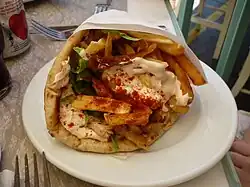 Gyrádiko (plural girádika) restaurants serve the popular Greek dish gyros. In Greece, gyros are typically prepared using spiced ground pork shoulder meat on a pita with tzatziki sauce, while in the United States, they are commonly prepared with ground lamb sliced from a vertical rotisserie spit.