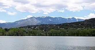 The western part of the valley borders the San Isabel National Forest. Lake Beckwith, a reservoir managed by the Colorado City Metropolitan District and also a state wildlife area managed by Colorado Parks and Wildlife, offers fishing, walking, and canoeing.[4][5] Greenhorn Mountain, the highest peak in the Wet Mountains at 12,346 feet (3,763 meters), overlooks the valley from the west and dominates the view.[6] Greenhorn Creek rises on Greenhorn Mountain and traverses the valley which is situated where the creek leaves the mountains and emerges onto the Great Plains. The valley has an elevation of 6,800 ft (2,100 m) at Rye and 6,000 ft (1,800 m) at Colorado City.[7]
