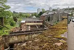 The West Burn flows down adjacent to Inverkip Road, and originally powered water mills downstream from the station site,[20] where a sugar refinery originated in 1826, and was expanded by John Walker and Co from 1848.[21][22] The river was culverted under the G&SWR railway and Inverkip Street, then taken above the West Station platforms and railway line in an open metal trough forming an aqueduct leading to a reservoir or mill pond just to the north of the station.[8]