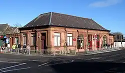 The Caledonian Railway was granted permission in September 1882 to build the station, featuring "a very neat and substantial stone building in Renaissance style" at street level, with two "large and handsome" doorways from the booking hall onto Inverkip Street. The building also provided a stationmaster's room, a general waiting room and two first class waiting rooms; one for ladies and one for gentlemen.[6][7]