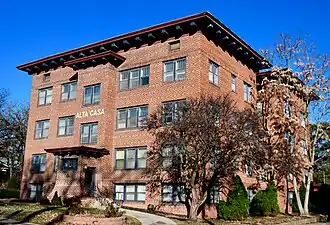 The historic district is the northwest section of a former suburb known as Greenwood Park. It was incorporated as a city in the area of Brown's Park in 1881, and in 1890 it was annexed into the city of Des Moines. The Greenwood Park Association bought Brown's Park 1892. While it was platted for residential development, housing was not built here until 1910 and into the 1920s. For the most part, it continued to be used as a park until then. The part of the district north of Ingersoll Avenue is exclusively residential.[2] Apartment buildings were built in the Greenwood Park Plat from 1918 to 1926, and five of them remain. Three churches were built in the district between 1922 and 1938. They include St. Augustine Catholic Church (1922), Plymouth Congregational Church (1926; now United Church of Christ), and Central Presbyterian Church (1938). Four medical buildings and an office building were built along 39th Street and on Ingersoll Avenue between 1955 and 1961. Prior to this, there was virtually no commercial development in Greenwood Park.[2] Five more were completed between 1963 and 1975.