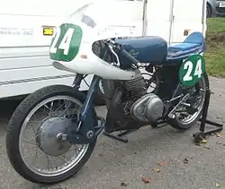 Greeves also made a successful entry into road racing with the 250 cc Silverstone model. These were a production Clubman's model with a reputation for reliability and were chosen to be the standard motorcycles for the Mortimer-Beart Road Racing School.[5] When winning the 1964 Manx Grand Prix, London-based Rhodesian Gordon Keith also took the Greeves racer to the fastest lap of the race – his last of the four-lap race – at 87.6 miles per hour (141.0 km/h), which proved to be the best speed ever by a British 250 cc motorcycle, with a race-average of 86.19 miles per hour (138.71 km/h). From the next five places, four were Aermacchis.[12]