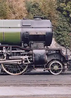 Although the problem could be contained in a peacetime environment with regular maintenance and inspections, it proved to be poorly suited to the rigors of heavy running and low maintenance levels of World War II. This gave rise to big-end problems on the centre cylinder connecting rod on the famous A4 class of streamlined Pacifics and many of these locomotives were fitted with a reduced diameter piston and had the inside cylinder sleeved down as a temporary measure. LNER Class A4 4468 Mallard suffered centre cylinder big-end damage (indicated to the driver by the fracture of a "stink bomb" attached to the bearing, which fractures during overheating of the white metal) during its world record run and was forced to limp back to its depot for repairs afterwards. Gresley's successor at the LNER, Edward Thompson, was critical of this particular valve gear.[7] As well as introducing new two-cylinder designs, he set about rebuilding Gresley locomotives with separate sets of Walschaerts valve gear for each cylinder.[8] Under later British Railways ownership, the application of former Great Western Railway workshop practices for precise alignment of the valve gear and in the manufacture and lubrication of the inside big end bearing effectively solved the problems.