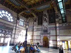 The station building was designed by Izaak Gosschalk and combines Neo-Gothic and Neo-Renaissance elements.[1]