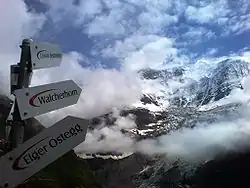 ![]() The north face (Fiescherwand) of the Fiescherhorn (Grosses (right) and Kleines Fiescherhorn (middle), and Finsteraarhorn in the back (left)) | |