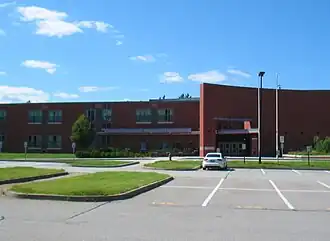 The regional school district was established in 1967[24] with the high school located on Main St. in Groton. In 1997, the school adopted 4x4 block scheduling.[25] In 1999, the "new gym" at the Main Street campus was renovated and renamed as the Peter Twomey Youth Center (PTYC) in order to honor a then recently deceased student. The PTYC is now "...a self-supporting facility that provides space for youth athletic leagues, adult education, and youth groups in Groton and Dunstable."[26] With the student population expanding from 370 in 1993[27] to its current levels, a new building was needed. In 2003 at cost of $35 million,[28] the high school relocated to its current location near the border between the two towns it serves.