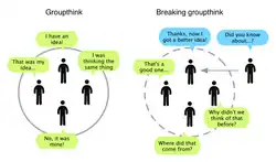 Groupthink is a psychological phenomenon that occurs within a group of people in which the desire for harmony or conformity in the group results in an irrational or dysfunctional decision-making outcome. Cohesiveness, or the desire for cohesiveness, in a group may produce a tendency among its members to agree at all costs.[1] This causes the group to minimize conflict and reach a consensus decision without critical evaluation.[2][3]