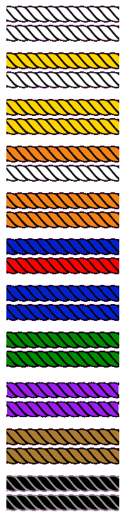 Grupo Capoeira Brasil uses eight different colors in their graduation system. They are: Yellow, Orange, Red, Blue, Green, Purple, Brown and Black. Beginner students (before becoming Graduados) have transitional cords between the main cords, for example: Yellow and Raw cord.