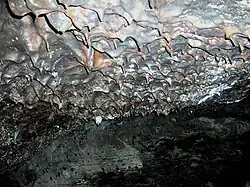 The tunnels formed within a pāhoehoe type lava flow. The top of the flow cooled against the air and formed a solid crust, while beneath it the liquid lava continued to move. As the amount of liquid lava passing through them decreased, the tunnels emptied.[3] Silica oxide is also seen in walls of the cave in some stretches of the cave.[4] At the main entrance, after passing through the ‘Algar da Ponte’ ("Algar Bridge"),[10] there is an avenue of trees. Some forms of plant life like ferns, mosses and lichens are also noted at the portal, floor and walls of the cave opening.