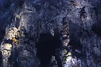 Cacahuamilpa is one of the largest cave systems in the world.[4] It is a "live" cave system, meaning that groundwater still filters down into it, and that the formations there are still growing.[3] Inside the cavern system are ninety large "salons" separated by large natural rock walls and connected to one another via a central gallery.[4] However, only about twenty of these are fully explored and open to the public.[8] Most of these salons are located under the Cerro de la Corona, a limestone mountain ridge.[6] The publicly-open portion is essentially a two-km-long, level passage of linked “salons” or borehole openings.[4] These salons average about forty meters wide,[6] and vary in height from twenty to 81 meters.[2] Most have names which reflect the major formations found in them such as the Goat Salon, the Throne Salon and the Cathedral Salon.[4] All the openings numerous rock formations growing from both the ceiling and the floor.[4][6] One of the drier salons has been dubbed the “Auditorium”. It has a large flat floor and has been outfitted with seats. It is rented out for events,[2] and has been the site for a number of concerts including one in 2007 by Miguel Bosé[9] and one by the Acapulco Philharmonic Orchestra in 2009.[10]