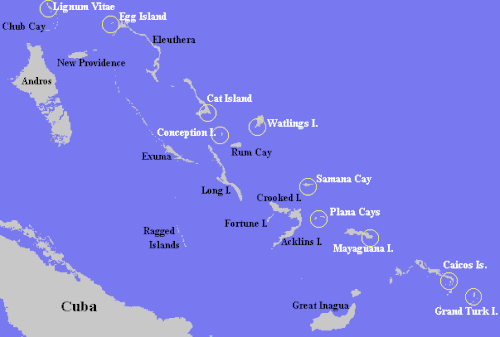 - Grand Turk Island, proposed by Martín Fernández de Navarrete in 1825,[34] but soon fell out of favor[35] until it was resurrected by Robert Power in 1924.