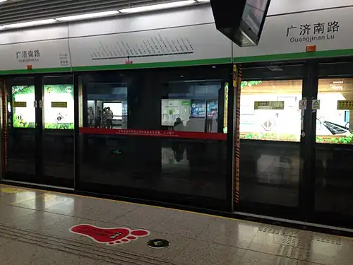 Guangji Nanlu Station (Chinese: 广济南路站) is a station of Line 1 & Line 2 of the Suzhou Metro. The station is located in Gusu District, Suzhou. It began operation on April 28, 2012 with the opening of Line 1. The Line 2 platforms began operation on December 28, 2013 with the opening of Line 2.[1][2][3][4]