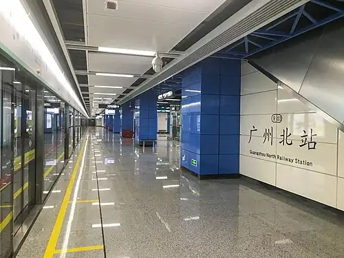 Guangzhou North Railway Station (Chinese: 广州北站) is a metro station of Line 9 of the Guangzhou Metro. The metro station opened on 28 December 2017.[1] It will be served by Line 24 in the future.[2]