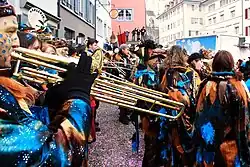 Guggenmusik is played during Fasnacht, the Swabian-Alemannic carnival season (Swabian–Alemannic Fastnacht), which is celebrated in various localities as the Basler Fasnacht, Luzerner Fasnacht, Eis-zwei-Geissebei in Rapperswil, and many other terms. The most common explanation of the word "Gugge" is that it may derive from the Alemannic "Sack/Tüte", meaning "bag". Other unsourced explanations include the word used for a small children's trumpet, a (Swiss German) word for "scream", or the cuckoo's call.[1] A "Guggemusik" band thus refers to a group of people playing loud music and typically wearing costumes and masks in a uniform style.